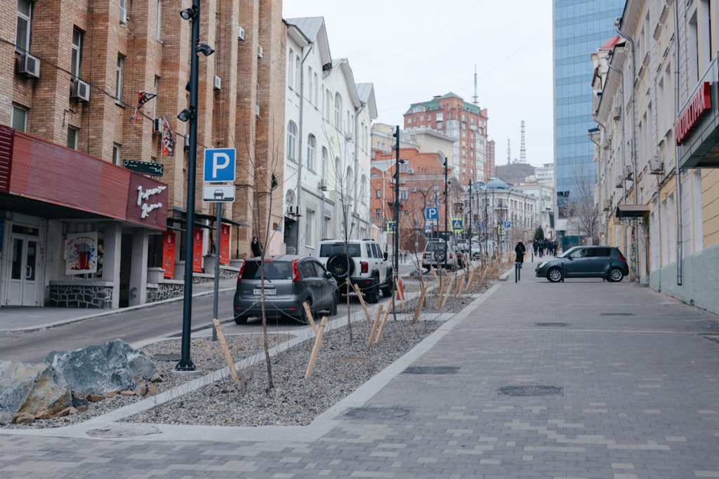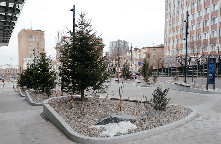 Затем были созданы удобные пешеходные зоны, связанные с существующими, организованы места для отдыха на пересечении с Океанским проспектом и Алеутской улицей, проведено озеленение. Высажены кустарники, деревья, многолетние цветы и травы.