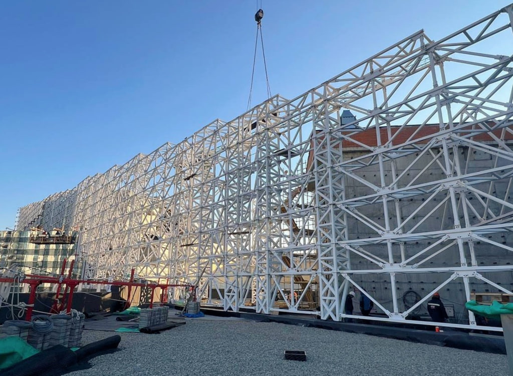 Как отметил генеральный директор компании-подрядчика «Стройтрансгаз-Восток» Сергей Мариинский, перголы — это не просто декоративный элемент, а сложная несущая конструкция, придающая зданию выразительную динамичную форму, построенную на треугольниках и трапециях. Следующей важной задачей после монтажа металлокаркаса станет его масштабное остекление.