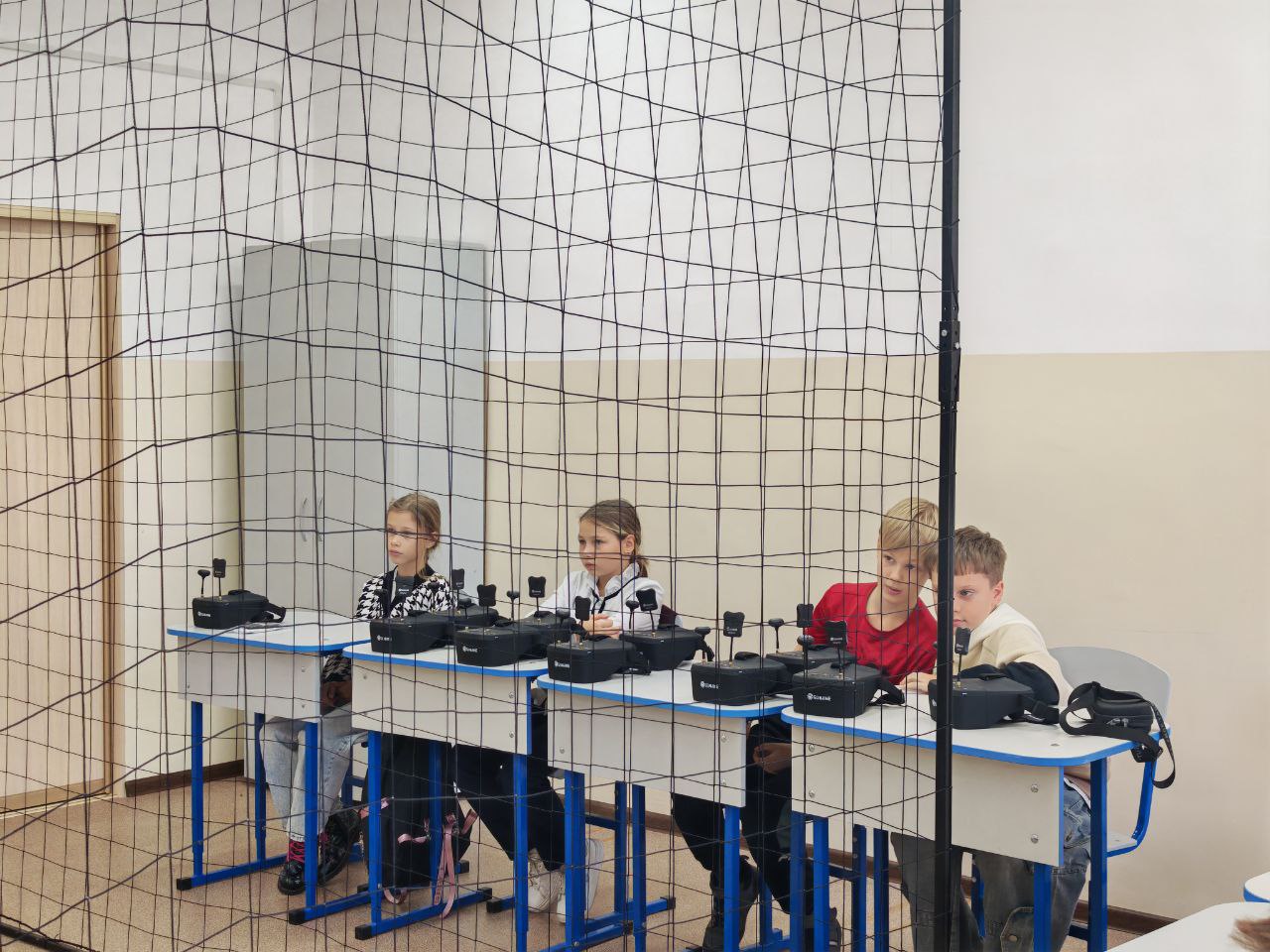 Класс, в котором проходят занятия, не совсем обычного вида. Центр класса, большой квадрат, затянут специальной сеткой. Она нужна для того, чтобы БПЛА при запуске случайно не вылетел и не повредил окна.
