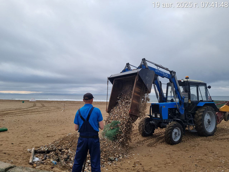 С раннего утра рабочие с помощью специализированной техники просеивают песок, очищая его от мусора, ракушек и мелких камней. А также вручную собирают крупный мусор и водоросли.